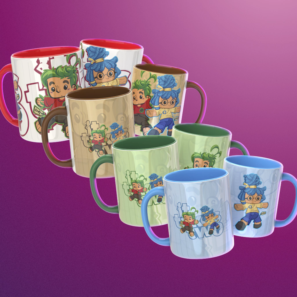 Caneca de cerâmica. Não é indicado para crianças abaixo dos 5 anos, principalmente porque pode cair no chão e fazer ploft.